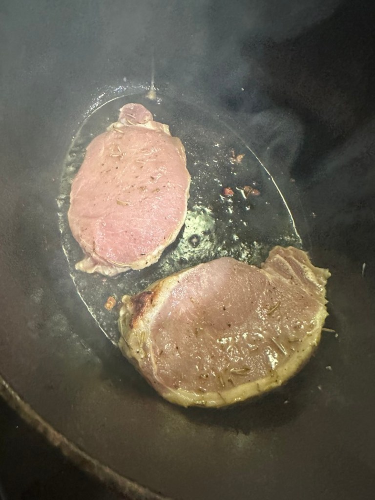 I was unpacking my meat order from Meridian Meats, as I do. Everything was in order. BUT I got one random Rosemary Garlic Pork Chop that I didn’t order. What? A free pork chop?!! Well I’m not gonna complain about a free little gift from the universe. But what the hell you do with one pork chop?