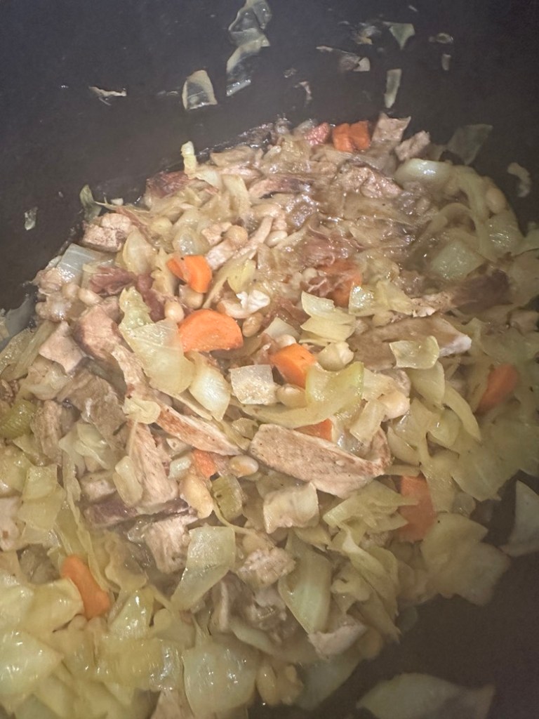 Twin pork chops, prosciutto, onions, garlic, carrots, celery, cabbage and my soul nourishing broth. I mixed chicken broth and beef broth because I’m pretty sure that equals pork? Anyway, pretty sure this was all pretty much free and so f*cking good.